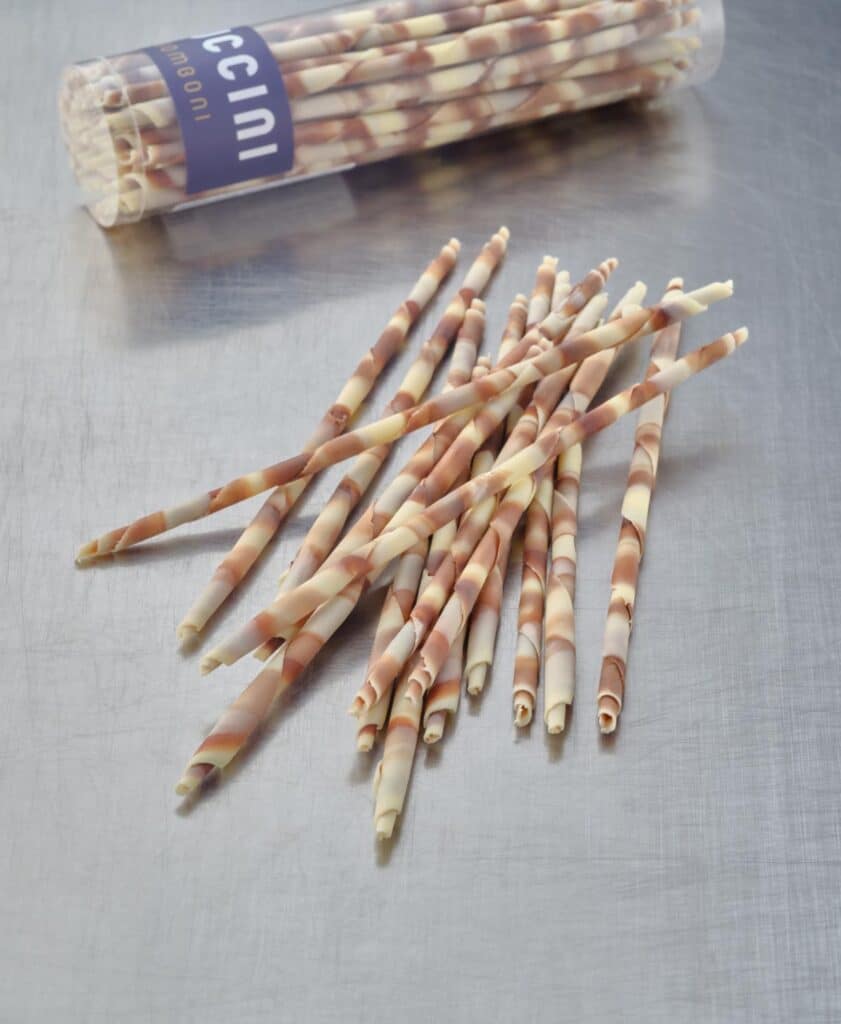 De Panatella’s worden gemaakt van chocolade welke zo dun als papier is gewalst en vervolgens wordt opgerold tot een elegante potloodvorm. Naar wens kunt u kiezen voor een pure chocolade met decoratieve streepjes van witte chocolade of een gemarmerde variant. Perfect voor het decoreren van uw taarten, desserts, ijs of gewoon als traktatie.